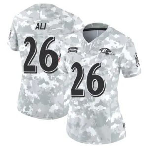 Women Baltimore Ravens Rasheen Ali Vapor Limited 2024 Salute to Service Arctic Camo Jersey $39.90