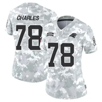 Home Carolina Panthers Saahdiq Charles Women Carolina Panthers Saahdiq Charles Vapor Limited 2024 Salute to Service Arctic Camo Jersey